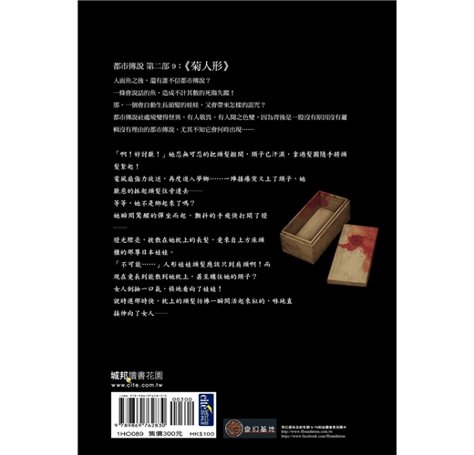 相關著作:《都市傳說第二部9:菊人形(都市傳說紙膠帶版)》《都市傳說第二部8:人面魚》《都市傳說第二部8:人面魚(年年有餘筷版)》《都市傳說第二部7:撿到的SD卡》《都市傳說第二部7:撿到的SD卡(撿到都市傳說文具袋版)》《都市傳說第二部6:你是誰》《都市傳說第二部6:你是誰(社員專屬鐳雕手機架)》《都市傳說第二部5:收藏家》《都市傳說第二部5:收藏家(鏟子湯匙版)》《都市傳說 第二部 4:外送(外送必備環保杯套版)》《都市傳說第二部4:外送》《都市傳說特典:詭屋》《都市傳說特典:詭屋(時尚登山頭巾版)》《都市傳說第二部3:幽靈船》《都市傳說第二部3:幽靈船(隨船隨到杯墊版)》《都市傳說第二部2:被詛咒的廣告》《都市傳說第二部2:被詛咒的廣告(神祕燒錄光碟版)》《都市傳說 第二部1:廁所裡的花子(花子貼身小布袋版)》《都市傳說第二部1:廁所裡的花子》《都市傳說12(第一部完):如月車站》《都市傳說12(第一部完):如月車站(如月列車專屬仿舊卡套版)》《都市傳說11:血腥瑪麗》《都市傳說11:血腥瑪麗(美麗隨身小圓鏡版)》《都市傳說10:消失的房間》《都市傳說10:消失的房間(都市傳說鑰匙圈版)》《都市傳說9:隙間女》《都市傳說9:隙間女(隙間女手書籤版)》《都市傳說8:聖誕老人》《都市傳說8:聖誕老人(聖誕蓋布袋版)》《都市傳說7:瑪莉的電話》《都市傳說7:瑪莉的電話(背娃娃束口袋背包版)》《都市傳說6:試衣間的暗門》《都市傳說6:試衣間的暗門(手機置物架版)》《都市傳說5:裂嘴女》《都市傳說5:裂嘴女(裂嘴口罩版)》《都市傳說4:第十三個書架》《都市傳說4:第十三個書架(詭異檀香版)》《都市傳說3:樓下的男人》《都市傳說3:樓下的男人(特別夜光版)》《都市傳說2:紅衣小女孩》《都市傳說2:紅衣小女孩(特別版:溫感現影封面)》《都市傳說1:一個人的捉迷藏》《都市傳說1:一個人的捉迷藏(特別版娃娃3D卡書衣)》