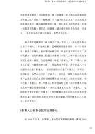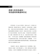 “我們得承認,過去六十多年來,港人的身份不時改變,不只一次,是多次的改變,連帶他們對事物的價值觀也不斷改變:什麼是對?什麼是錯?六十多年來,港人的價值判斷就這樣前後出現差異:往日是尊卑有序,今天講的是平等、自由。或許有人慨嘆:今不如古、世風日下,但改變了的身份和觀念是無法挽回的,我們就算不能欣然接受,也必須明白箇中變化的原因。”