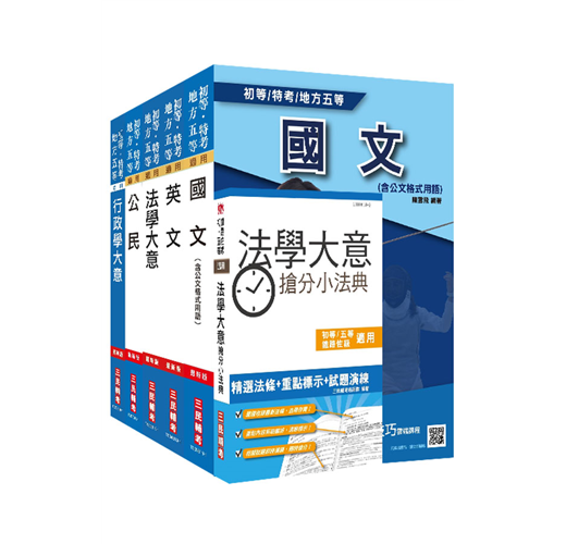購買初等、地方五等[一般行政]套書即贈送《法學大意搶分小法典》。小法典由三民專業名師群精心編審,便能輕鬆掌握命題趨勢及必背條文,無須再分心蒐集最新修法內容!