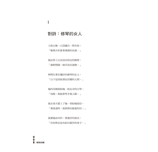 答:寫評論的鬼扯的居多,有幾位我認可的上一代的評論家,我沒好意思開口;我也找過兩位同輩的詩評家,他們都以博士論文大限為由,拒絕了我。不過沒有關係,詩會開口說話的,如果讀者的感受力在的話。