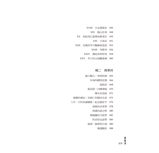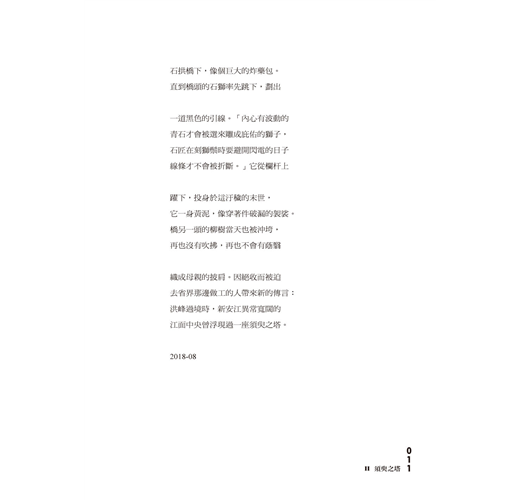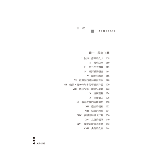 本詩集收錄葉丹2015-18年詩歌作品,作者以地方性的閱歷豐富詩歌主題,並以多元的創作形式展現敘事詩的各種樣貌。全書內文共分三大輯,以不同類型的創作格式區分:第一部分為組詩〈風物拼圖〉、第二部分短詩〈雜詩集〉、第三部分小長詩〈屏風〉。