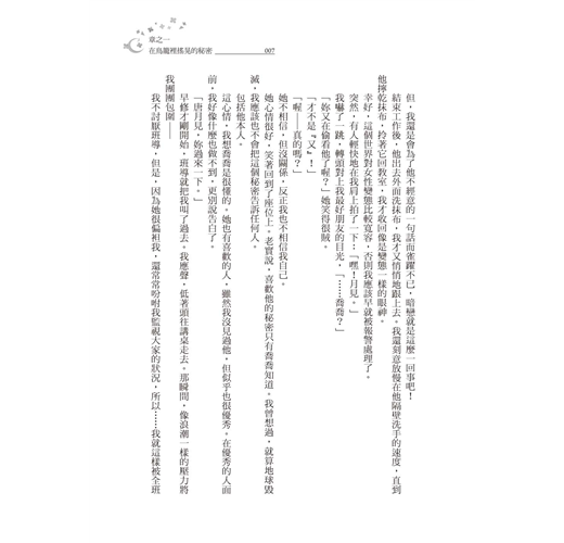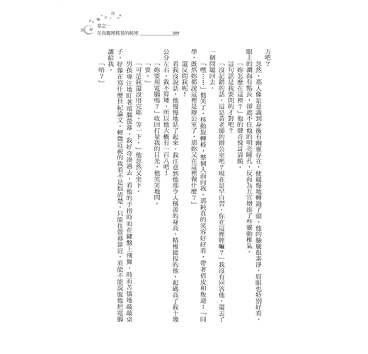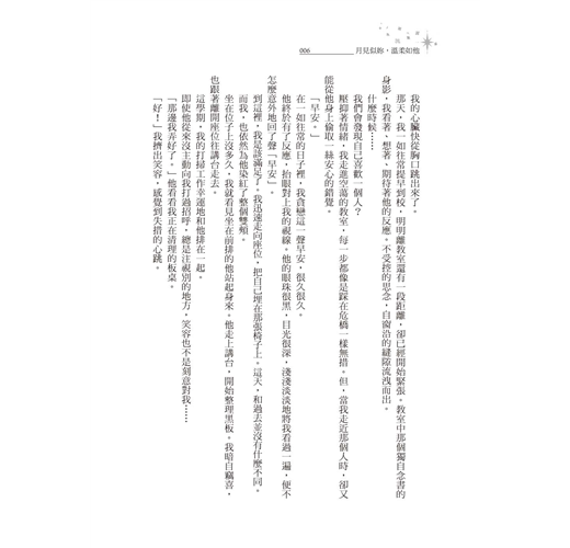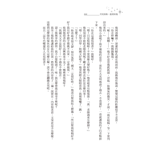「妳看起來很文靜、很有氣質,國文一定很好吧。」他逕自幫我貼上標籤:「所以幫我校稿好不好?我有好多錯字都挑不出來,一定會被罵。」