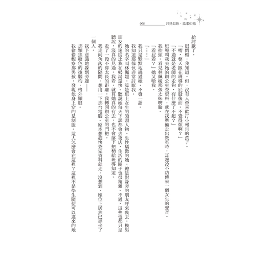 她的名字叫林姵媛,算是班上女生的領頭人物。生性驕傲的她,總是對身旁的朋友呼來喚去,換男朋友的速度比我在喝湯還快。聽說她每天下課都會去夜店,生活的圈子也很複雜。不過,這些也都只是聽說,沒真的見過。我看,就算她真的有去,也不會落下把柄給班導知道。