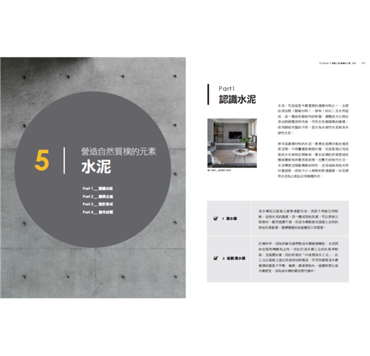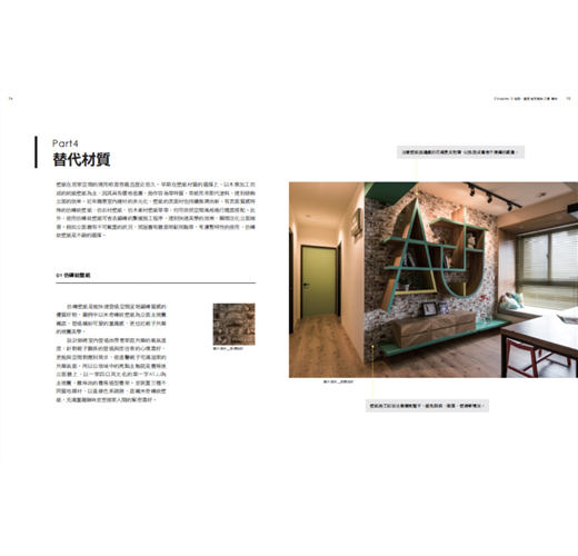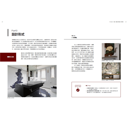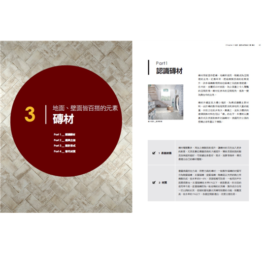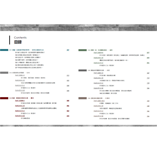 ◎從材料切入造型設計與工法,施工收邊完全寶典材質選用是立面設計的精髓,從選擇材質開始,為設計師嚴選石材、磚材、塗料、水泥、木素材、板材、玻璃、壁紙……等8種立面材質,從材質特性、種類介紹到挑選方式,一應俱全。邀集善用各式材質的設計師現身說法,以經典立面講解每種材質的造型與工法,期待設計師們能從中找到創新立面的靈感。