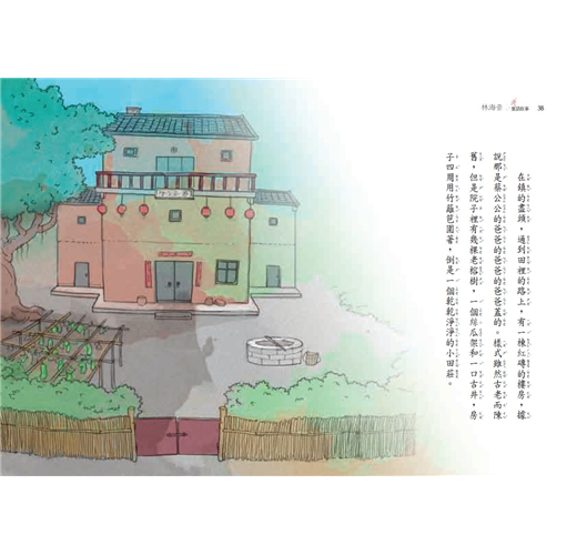 在鎮的盡頭,通到田裡的路上,有一棟紅磚的樓房,據說那是蔡公公的爸爸的爸爸的爸爸蓋的。樣式雖然古老而陳舊,但是院子裡有幾棵老榕樹,一個絲瓜架和一口古井,房子四周用竹籬笆圍著,倒是一個乾乾淨淨的小田莊。