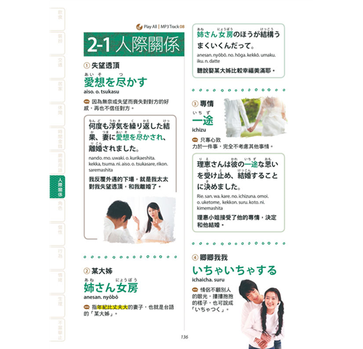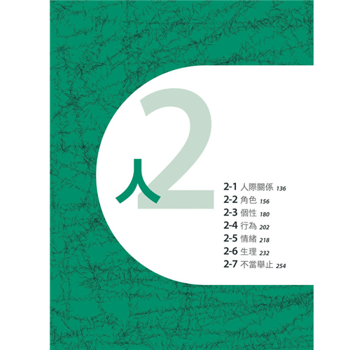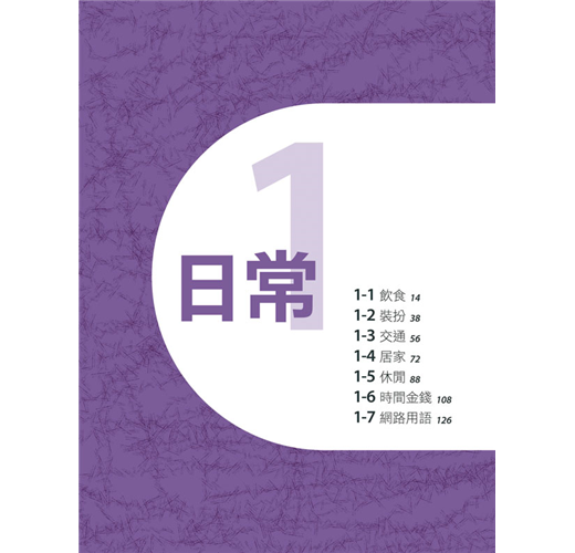 本書歸納成「日常」和「人」等兩大主題,其下再細分類為14個單元。包括日常生活息息相關的食衣住行、休閒、時間金錢、常用的網路用語;人本身的個性、情緒、生理,以及對外的行為和人際關係等等。