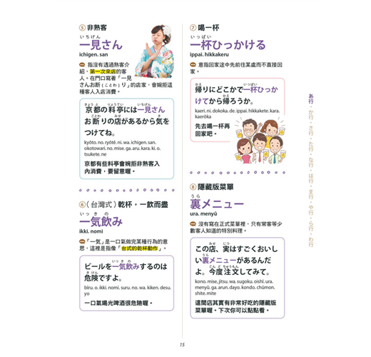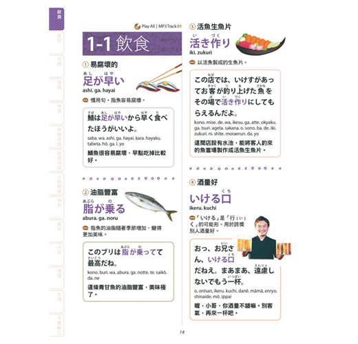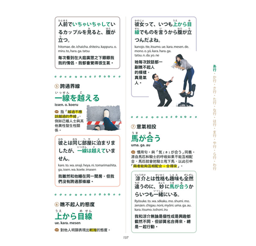 由專業的日文老師精心整理出約1100個日本人最常使用的慣用語,包括了可以見字辨義的詞,像是「アヒル口:鴨子嘴」、「腹八分目:吃八分飽」;或是需要先了解其原義或由來,才能明白引申義的字,例如「懐が暖かい:荷包滿滿」、「御曹司:富二代」;甚至是「モンスターペアレント:怪獸家長」、「パリピ:狂歡咖」等和製英語或流行語的說法。針對這些用語的來源及用法情境,加上簡單易懂的說明及實用例句。另外在假名上標記了羅馬拼音,希望讓日語初學者也能試著唸唸這些有趣的慣用語,藉以增加學習的成就感。全書搭配全彩圖片幫助記憶,讓讀者能看圖理解並靈活運用這些慣用語。