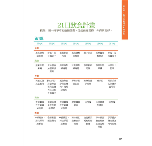 如果你喜歡一絲不苟的遵照細節,大可分毫不差的執行 21日計畫,把它當成你的營養地圖。不過你也可以視個人健康的需求,換著吃,以配合自己的生活方式。