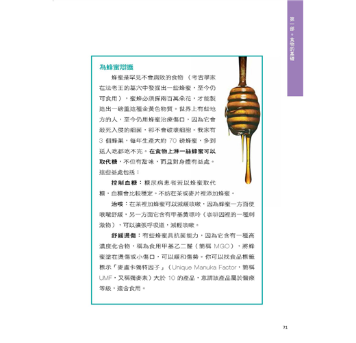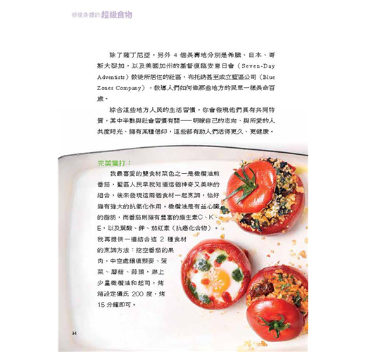 食物是良藥:義大利文「藥房」(英文為pharmacy)這個字的拼法是farmacia(按:farm即農耕、農場之意),含有許多真義。世界上最好的療方,有一些正是長在農田裡,超市裡都買得到,如果你懂得吃對的食物、會料理,它們隨時都可以在你的身體裡產生作用。正確的食物甚至可以取代每天必吞的藥丸。