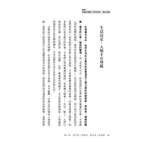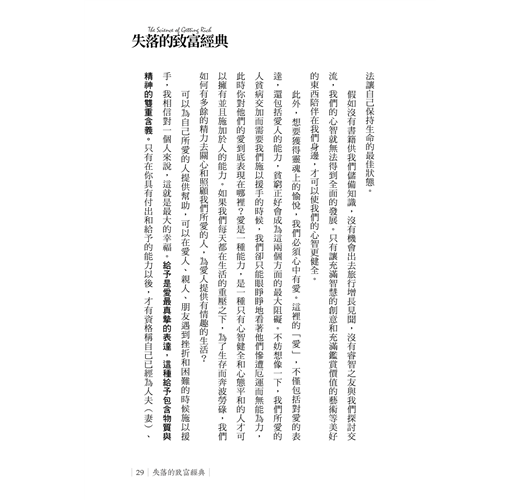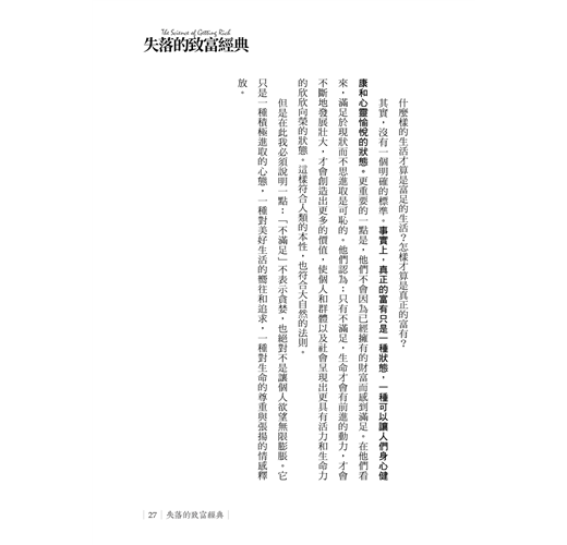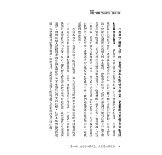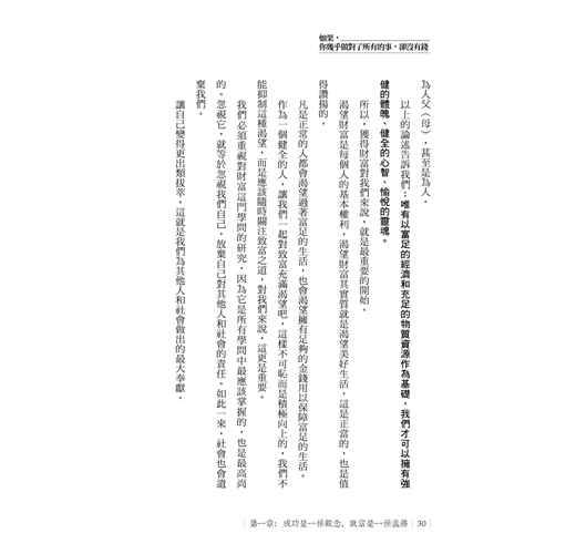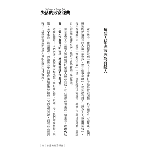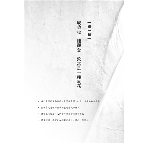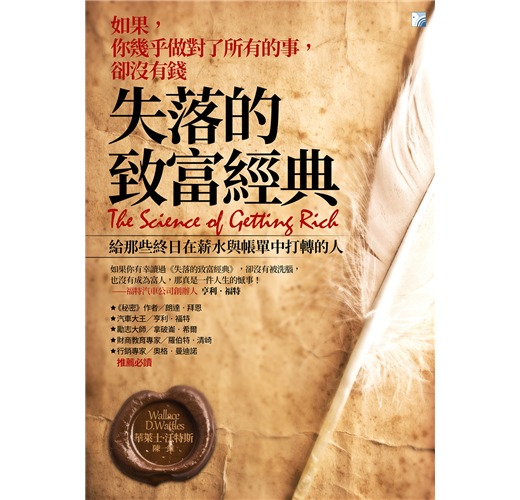獻詞 華萊士‧沃特斯經典語錄 譯者序:獲取財富與成功的思維法則 作者序:以「特定的方式」走向富足 第一章:成功是一種觀念,致富是一種義務 每個人都應該成為有錢人 生活富足,人類才有尊嚴 第二章:不依靠運氣的致富方法論 致富其實不需要天分 致富只需要有方法 第三章:只要你願意,財富無處不在 第四章:創造財富的第一步是思考 創造財富的第一步是思考 致富從正確思考做起 第五章:財富是創造出來的,而不是搶來的 完美人生從致富開始 不做競爭者,要做創造者 第六章:越努力越幸運,財富越會青睞你 第七章:心存感恩,就像已經成功了一樣 第八章:人們之所以能,是因為堅信自己能 第九章:用自控力掌控時間、情緒、生活 自控力是致富的最好內驅力 用自控的力量消除貧窮 第十章:給自己打上「富人」的標記 世界上只有財富沒有貧窮 自信是最大的能量 第十一章:富人相信奮鬥,窮人幻想暴富 就是現在,立刻行動 思想與行動和諧統一 第十二章:專注於效率,就可以超越自我 做細節的精神,做大事的速度 用專注的力量做好一件事情 第十三章:興趣和愛好是人生最重要的財富 第十四章:滿足於百萬財富的人不算是富翁 隨時給人們不斷進取的印象 不斷進取的人,才可以成為卓越的人 第十五章:追求卓越,就可以收穫成功 不要安於完成本職工作 追求卓越的人,可以獲得更多機會 第十六章:財富的吸引力法則 思想決定成敗 堅定的信念必不可少 第十七章:開啟財富之門的鑰匙 附錄:吸引力法則與財富的秘密 一、吸引力法則 二、財富的秘密