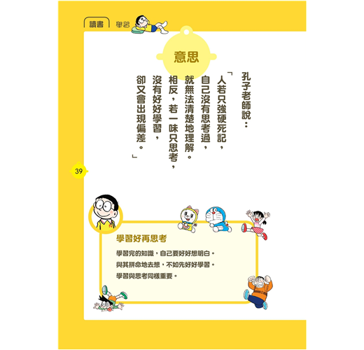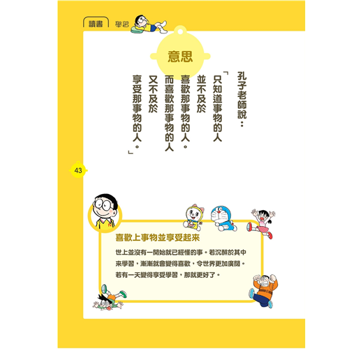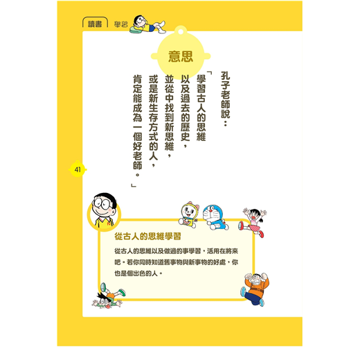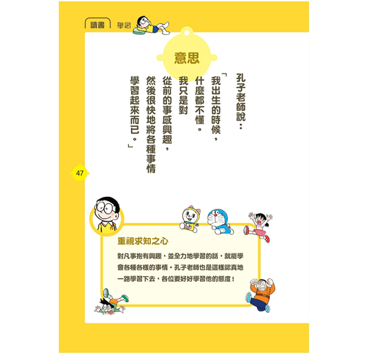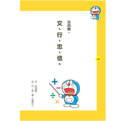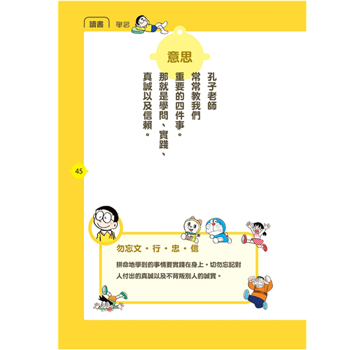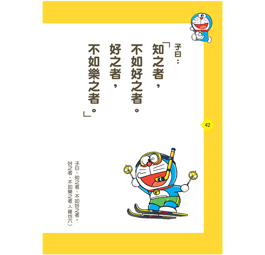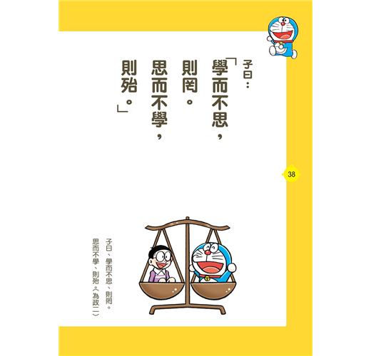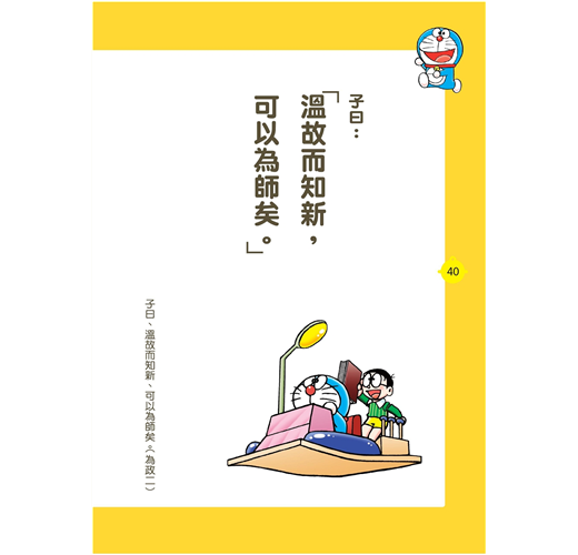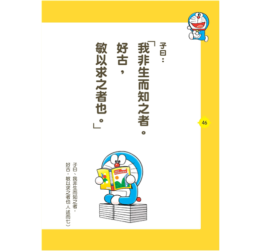 本書以日本漫畫哆啦A夢的角色,講解從2500年前由儒學家孔子及其弟子的著作《論語》中,精挑細選當中40句以上的至理明言。內容對小朋友有益之餘,不失哆啦A夢原有的趣味性。先透過漫畫讓小朋友提起對論語的興趣,再以淺入深地講解精選的論語,適合從小培育小朋友的善良個性。