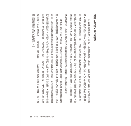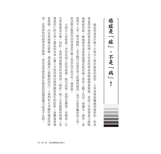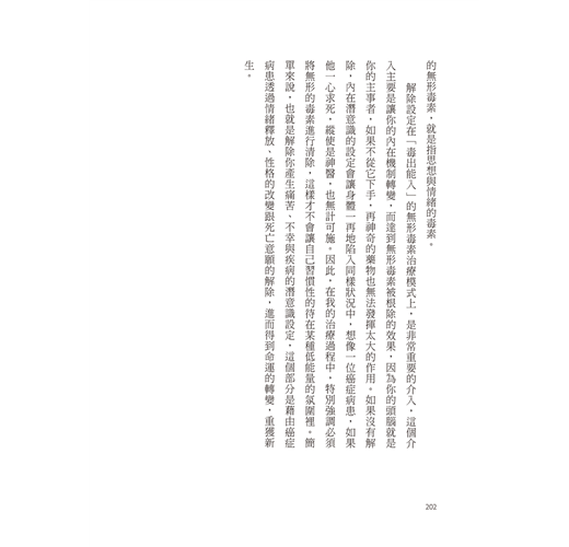 俗話說,心病還需心藥醫,解除死亡意願,是癌症患者回復健康的重要關鍵。本書從原生家庭、父母、親友或伴侶等關係中,歸納出13個影響生命的人生課題,透過一對一諮詢或團體排列等「人生動力」的治療方式,解除長期糾結的潛意識設定,引導你認識自己,找到活下去的人生動力。
