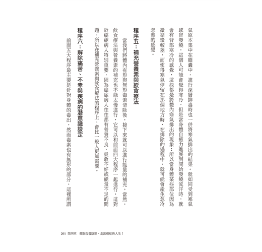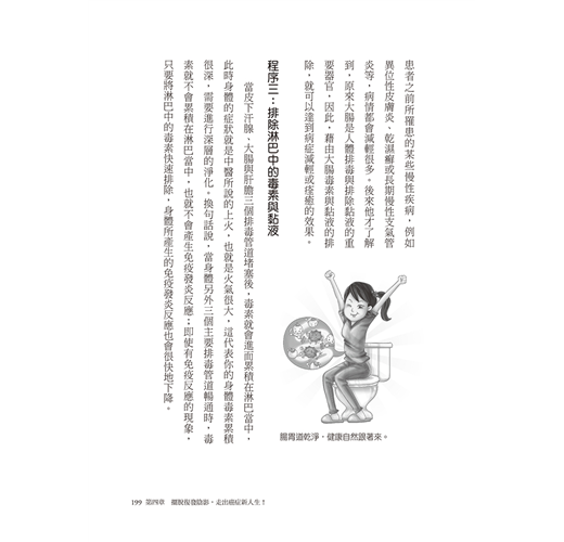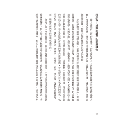★「傷寒論」、「六期論」東西兩大醫家,告訴你疾病惡化的真相:身體毒素的累積都是由表到深、由外到內,由上到下,如果了解疾病惡化的進程,就能提早防範,避免罹癌。第一期是微循環惡化,身體容易手腳冰冷、無法發汗;第二期是腸道宿便過多,容易引起腸漏症、慢性過敏和慢性發炎;第三期是淋巴循環不良,造成肝膽機能衰退;第四期毒素會深入肺腔腹腔以及關節,容易有痰多脾濕、關節炎、過敏現象;第五期毒素侵入到心血管和腎臟系統,容易造成腎衰竭和心室肥大等疾病;第六期就是所謂的「病入膏肓」,是末期重症和癌症病患常見的現象,毒素累積到肝臟和心包膜,通常很難排出,因此會漸漸步向死亡。