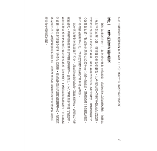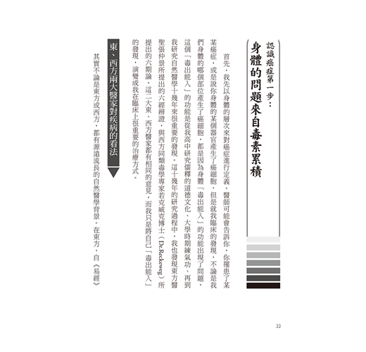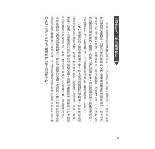 作者認為,不論身體哪個部位產生癌細胞,都是身體「毒出能入」的功能出了問題,也就是身體排出毒素、吸收營養能量的自癒系統當機了。如果能協助身體將毒素與黏液排出,腫瘤自然縮小、消退。這個發現,和東方醫聖張仲景傷寒論所提出的六經辯證、西方同類毒學專家克威克博士的六期論不謀而合。