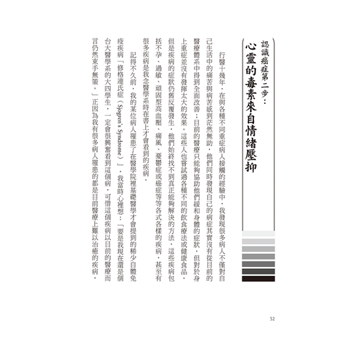 情緒和壓力也是一種毒素,如同累積在體內的大便一樣會影響健康。癌症病人通常是所謂的C型人格,是一般人眼中的好好先生和好好小姐,長期累積壓抑情緒的結果,就成了癌症的高風險群。要治療癌症 ,一定得包含情緒問題的處理,才能避免病情惡化或復發。