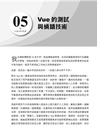 第5章:全方位地說明Vue的測試與偵錯過程中使用到技術與工具,包含Mocha的使用方法,如何為元件撰寫單元測試,如何在運行期和單元測試中進行偵錯,如何進行端對端測試。