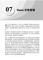 第7章:介紹Vue生態結構中針對規模龐大的前端程式進行狀態管理的利器Vuex,透過實例對Vuex的應用原則和結構組成進行剖析,說明如何將各種本來混亂的元件狀態透過Vuex將其進行分離,每個部分應該如何設計與編碼,如何進行測試,最後使Vue前端工程架構變得更為合理。