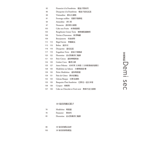 本書在這兩個章節分別介紹25道食譜,共計收錄50道點心。不管是何種點心,都是該店引以為傲、結合了創意與手藝的經典商品。