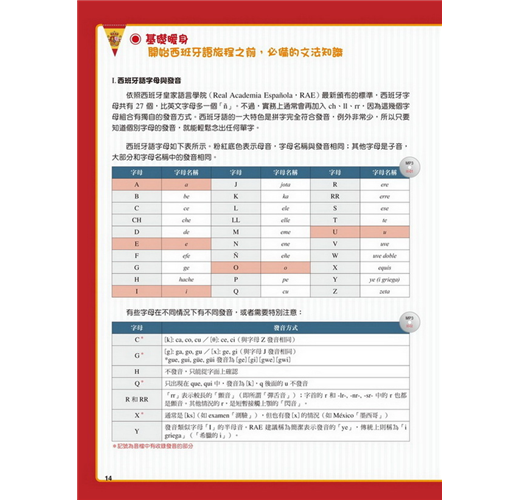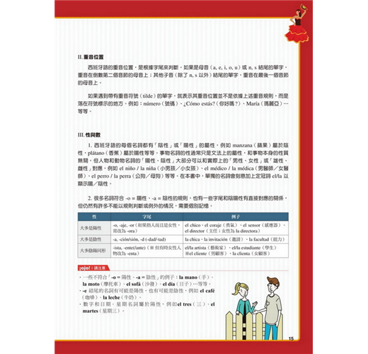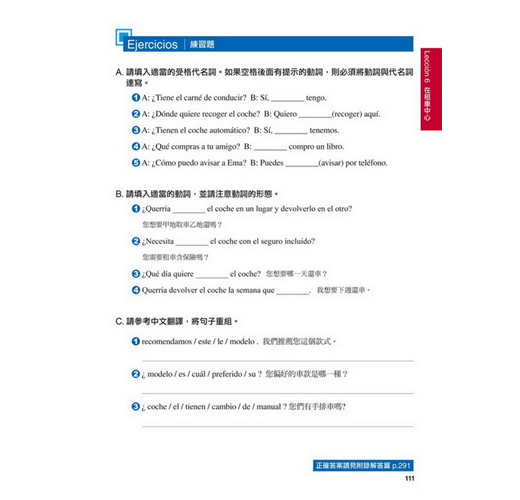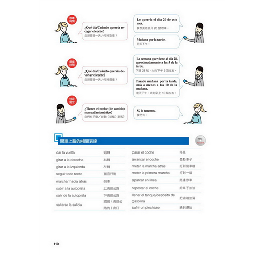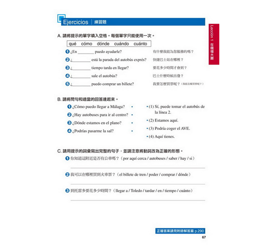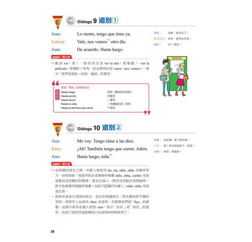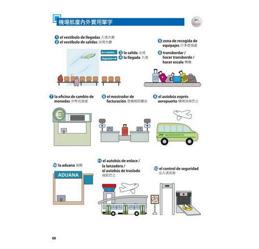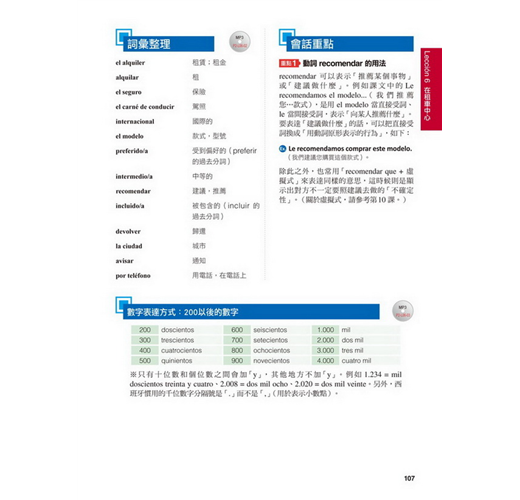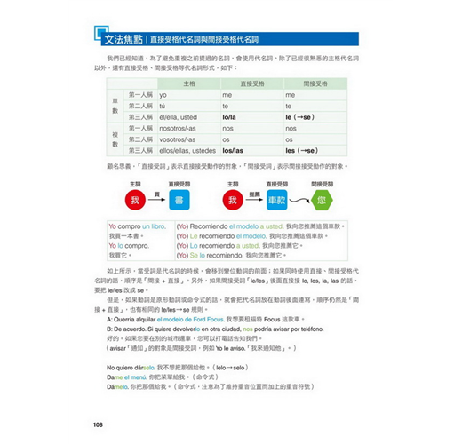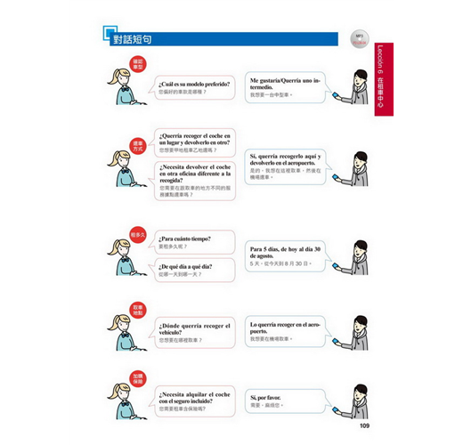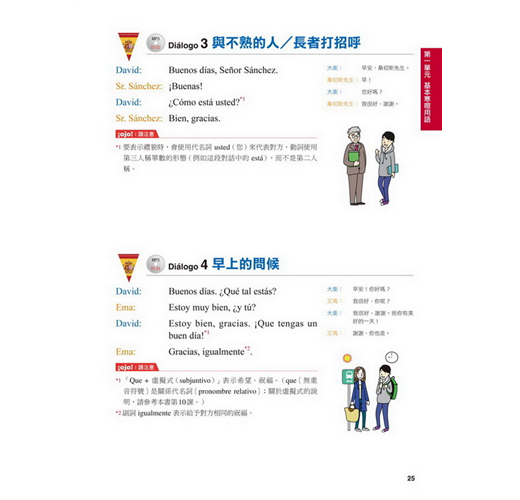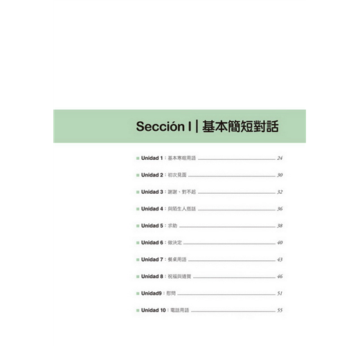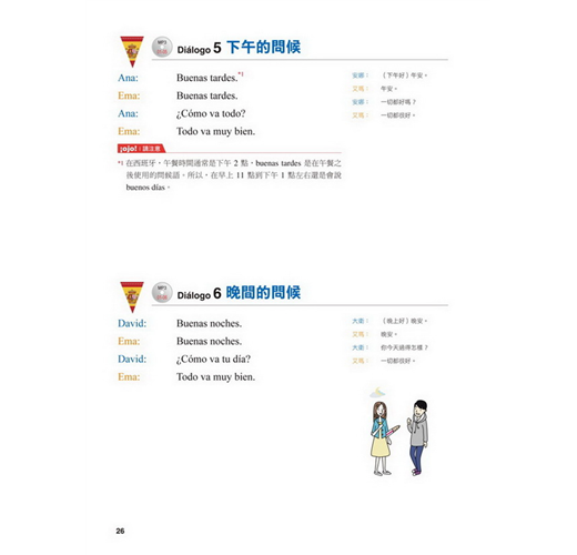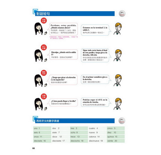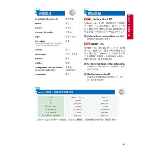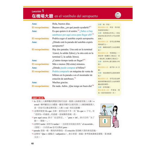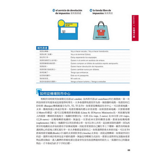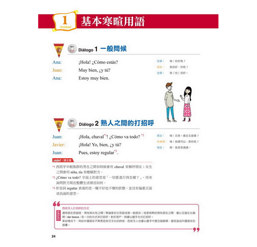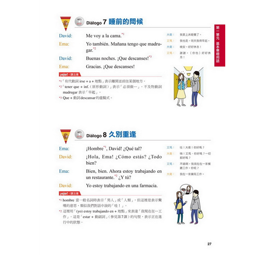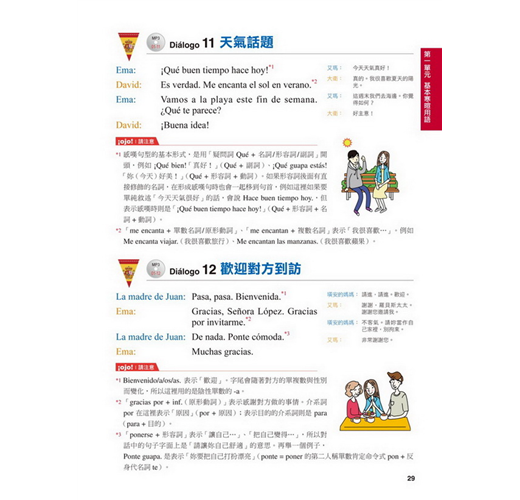 【特點2】結合生活溝通與文法學習的「場景會話」在本書的主要課文部分,以實際旅行和留學的經驗為出發點,從抵達機場、搭車、入住飯店到用餐、觀光,在24個場景中,針對各種可能遇到的情況,帶領你說出西班牙生活中的大小事。同時,每一課都結合了一個文法學習主題,包括疑問句、命令式、關係子句、各種時態等等,學完本書就等於精通了初級到中級的必要文法。