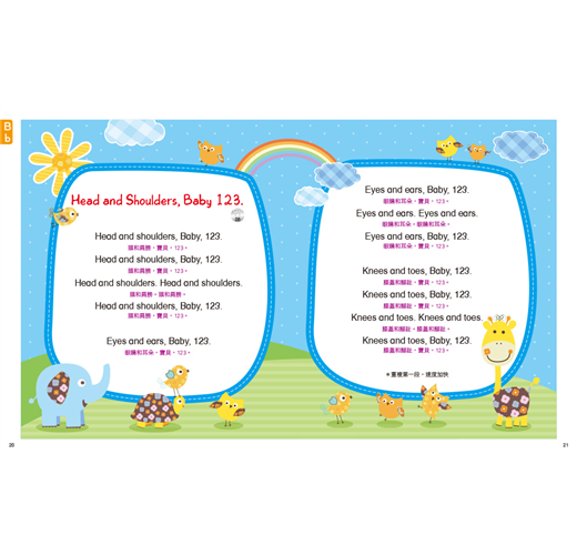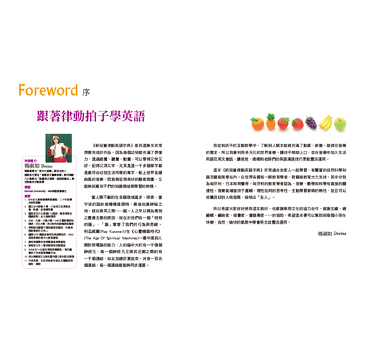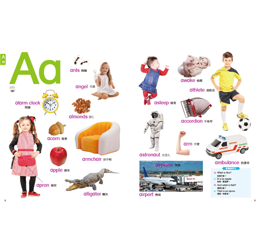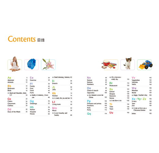 本書以日常生活中易見的事物,配合生動的圖片和簡易的中、英文單字,規劃以英文字母A-Z共46個主題單元,加上10首英文兒童歌曲,讓小朋友從生活中學習英語。