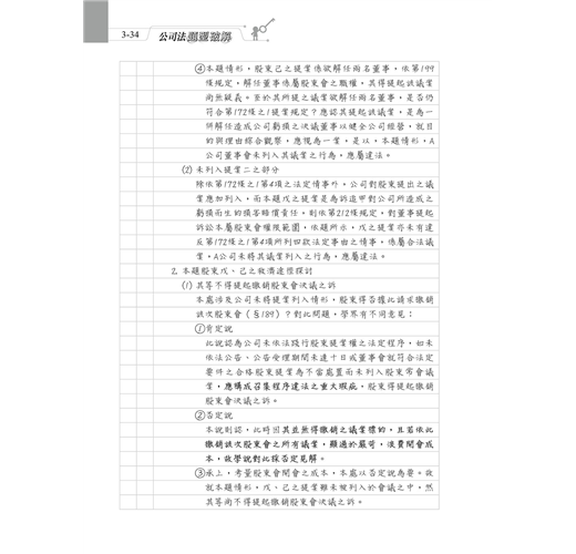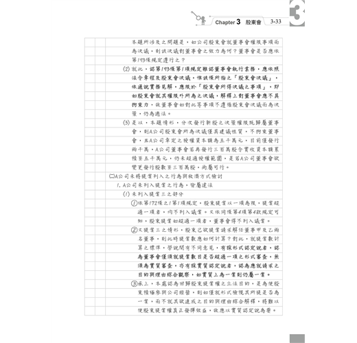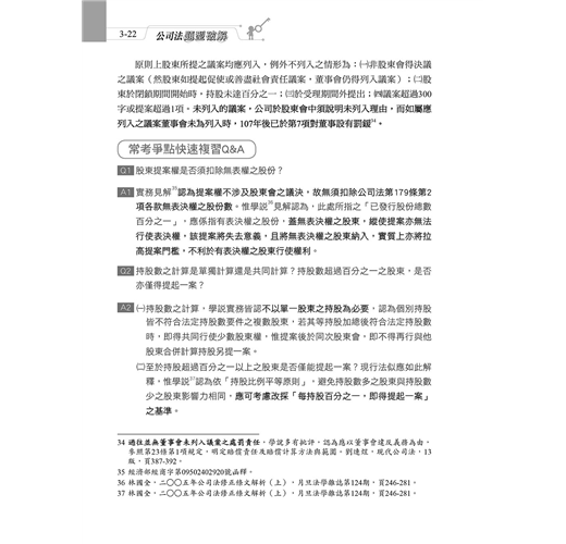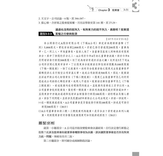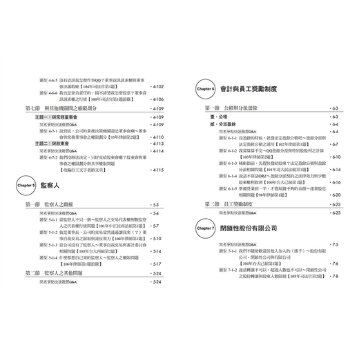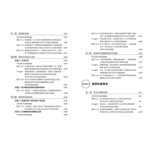 本章雖是全書篇幅最多的一章,但羅列許多重要觀念,前面討論過的題目也有許多在本章與其他爭點結合出題,相信同學照著前面章節循序漸進練習完本章之後,對公司法考科的掌握度將提高到一定程度,請務必加油撐過此章唷!