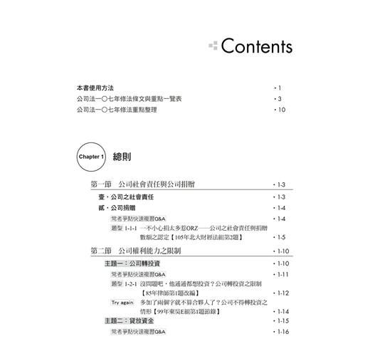 本書蒐集了歷年來重要的公司法考題,並羅列現行公司法重要的學說及實務見解。整體編排特色如下: