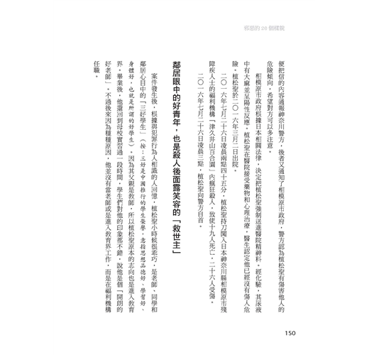 在撰寫本書推薦序的今天(2019年5月28日),日本神奈川縣川崎市早上又發生一起駭人聽聞的隨機殺人事件。一名五十餘歲的男子持刀砍殺19人,其中兩人傷勢嚴重,送醫急救仍不治,而行凶男子則當場自砍頸部,送醫後也死亡。此次川崎市隨機殺人事件,為日本1999年東京都池袋地區隨機殺人事件發生以來的第七起。所造成的傷亡規模,僅次於2016年同縣的相模原市「津久井百合園」事件(中央社:日本隨機殺人不斷,2016年單起事件19死最慘重〔2019年5月28日〕。本書也會在第八章介紹)。