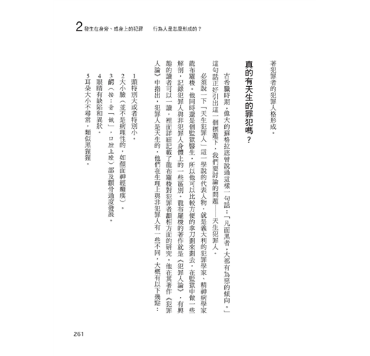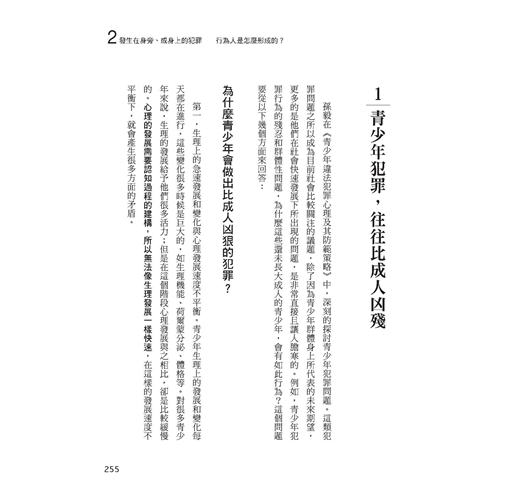 本書針對我們看到犯罪新聞時常有的疑問深入討論,例如「人為何會有非理智的暴怒,進而犯罪?」、「犯罪者是否天生注定?」、「虐待動物與犯罪的關聯性」、「負面標籤、污名化怎麼來?又會如何影響人們成為犯罪者?」等。書中第二部分則持續探討幾個關於犯罪的重要議題,包括「為什麼青少年會做出令人驚訝的犯罪?」、「童年環境對犯罪人格的形成影響有多大?」、「約會強暴的比例為何這麼高?」等,也談到現在常見的家庭暴力、校園霸凌的形成因素,與建議的因應策略。