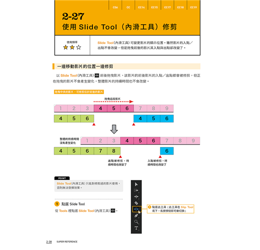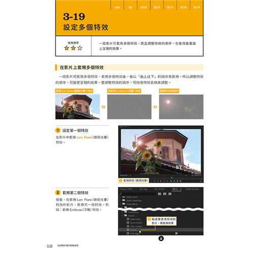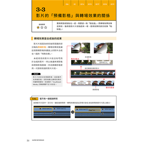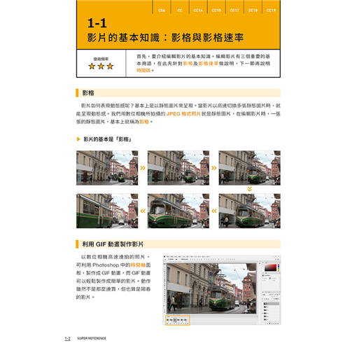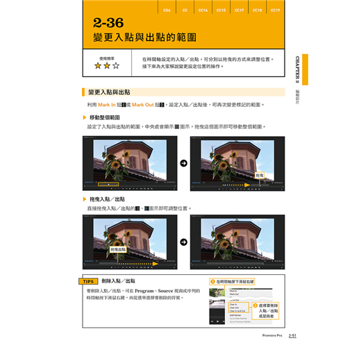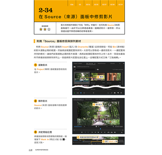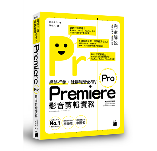 本書以淺顯易懂的說明帶您進入 Premiere 的剪輯世界,每個主題以 2~4 頁的篇幅做介紹,讓初學者不會感到壓力,並適時輔以示意圖說明剪輯的觀念,對時下熱門的 VR 影片、在手機上剪輯的方法、以及發佈到 FB、YouTube,也有具體的說明。不論您是對 Premiere 毫無頭緒或是曾經用過舊版 Premiere 升級至 CC 版,想學習更多技巧的人,都可以從本書找到答案。