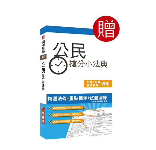 購買初等、地方五等[經建行政]套書即贈送《公民搶分小法典》,小法典由三民專業名師群精心編審,內含公民類科常考的法規條文,每年改版收錄最新修正條文,去蕪存菁,無須再分心蒐集最新修法內容!一本輕鬆掌握命題趨勢及必背重點,擁有此書,助您強勢奪榜!