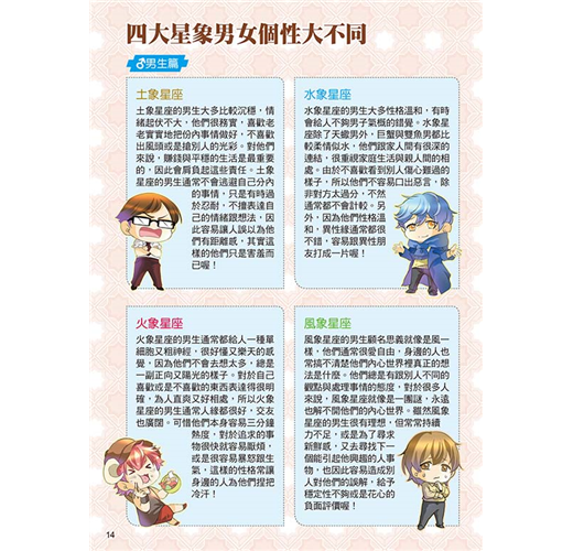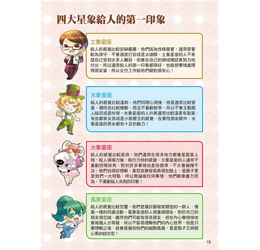 用星座結合漫畫,加上好玩有趣的測驗遊戲,讓讀者了解自身與別人的優缺點,從中學習到許多知識與正確的生活觀,使每位讀者都能了解自己,也能尊重別人,成為人人稱讚的小紳士與小淑女!