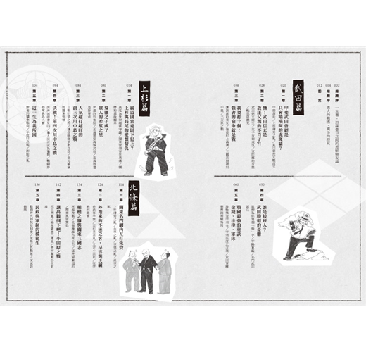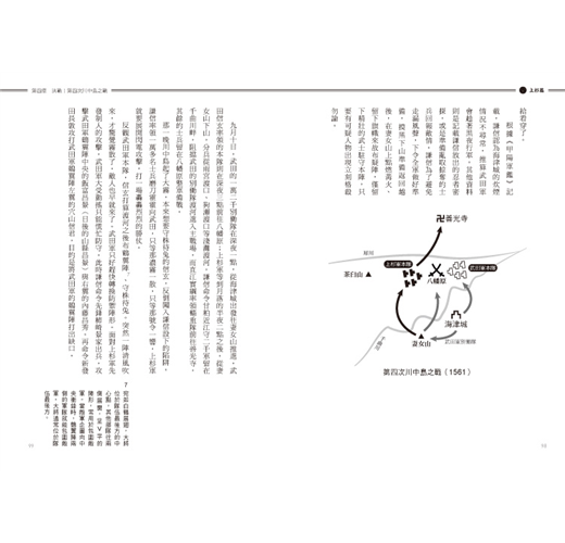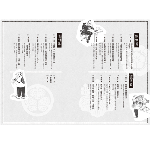 武田談的是「武田軍團」,上杉是「上杉一族與長尾一族」,北條是「關東局勢」。織田談的是「桶狹間之戰、長篠之戰」,豐臣談「檢地與刀狩」、德川則是「關原之戰、大坂之陣」。這些都是讀者在接觸日本戰國時代歷史時,覺得非常重要但又不易理解的重點。
