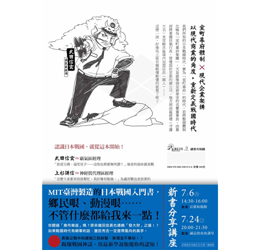 月翔跟我說,他不是正統派的戰國學者。但是正因為我們是「外行人」,而且是擁有興趣和熱愛這兩大武器的外行人。月翔的書就像櫻木花道一樣,擁有所謂專家沒有的親和力和滲透力,可以讓不熟悉日本、但是對戰國有興趣的朋友快速超越時空,彷彿置身於數百年的英雄爭霸現場。