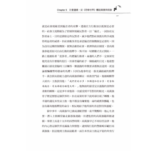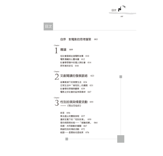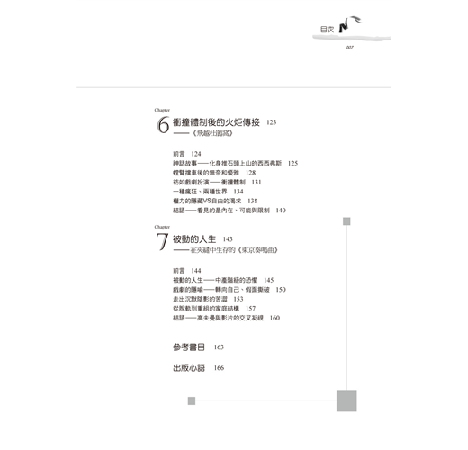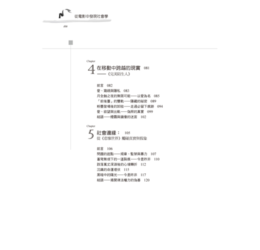 本書討論了五部電影:在《雙面勞倫斯》中,探討「跨性別」者在生活中實質困境與自我印象形塑的兩難,從社會各層面敵意與歧視的眼光,來檢視當代社會文化中的規範與行為體制;而《完美陌生人》是由人性弱點、窺視欲望、個體與他人互動、和諧與真實等面向切入,解剖的是婚姻長久經營的疲乏真相與各種困頓障礙;《悲慘世界》則是由影片思考社會中無處不在的偏見及對權力的傲慢,引出社會真實與假象的防護機制,釐清善惡與權力的界線;《飛越杜鵑窩》揭露體制衍生的社會議題與意識形態,本片的意涵早已跨越時空的限制,值得當代社會再行反思;《東京奏鳴曲》以普羅大眾「夾縫中求生存」的敘事內容,展現父權違建以及家庭與社會的偽善,揭露現代社會的壓抑與苦悶。