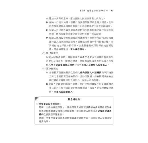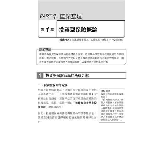 由財團法人保險事業發展中心辦理之「投資型保險商品業務員資格測驗」,此測驗為從事保險業務員的相關證照,欲投身於保險業,此資格為不可或缺的條件之一,亦為了保險業務員的基本科目。而想往保險業發展的社會新鮮人、大學畢業生、二度就業或轉職者,也需先獲取這項資格。本書即為參加投資型保險業務員所做的應試重點整理,全書重點有:重點整理、牛刀小試、章後精選以及仿真模擬試題,為達到系統化學習成效,本書依內容不同分門別類編排整理,並針對重點中較易混淆之處解析觀念,幫助你從練習中統整,進而加深印象,從容應試,並獲佳績。