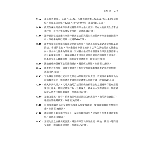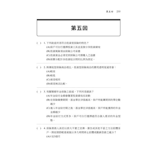 所有的大型考試,除了平日的認真準備,關切保險業的相關新聞或議題之外,練習試題也是十分重要的,唯有練習大範圍考題才能清楚的掌握考試脈絡,有助於自己在考場上能臨危不亂,增加得分的機會。因此本書由名師為你精心編錄仿真的模擬試題,並附詳解讓你一書完整掌握所有考情趨勢。在邁向保險業務員專業的路上,可獲得事半功倍之效。