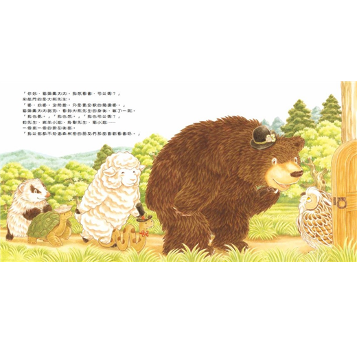 「你好,貓頭鷹太太。我想看書,可以嗎?」來敲門的是大熊先生。