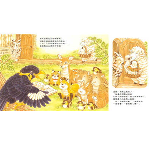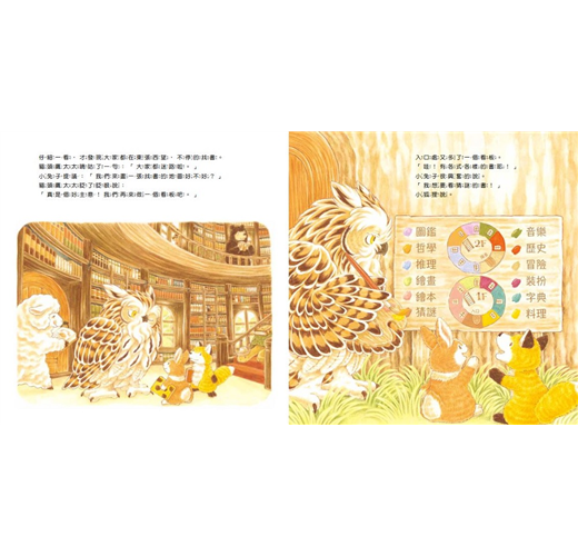 不久,森林裡的動物們也知道了這件事,紛紛聚集到貓頭鷹太太家,希望能夠找到自己喜歡看的書。獨樂樂,不如眾樂樂!貓頭鷹太太願意無私分享,但接下來卻發現有人找不到書、有人看書會不自覺念出聲音來、有人一看書就想睡覺……小讀者們隨著繪本故事有趣的情節,了解圖書館的規則、圖書的分類,也聯想到圖書館中的說故事活動,甚至也會想在家中、幼兒園裡玩「創立圖書館」的扮家家酒吧。