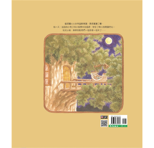 哇啊!好熱鬧、好溫馨的畫面。光是這張封面,就凝聚了許多小故事,大朋友陪著小朋友讀完繪本之後,可別忘了再回頭仔細瞧瞧這張封面,可以跟小朋友一起編織對話和內容喔。除了封面,封底也延續了「森林圖書館」誕生的這一天,明月高掛的夜裡,貓頭鷹太太在陽臺的吊床上,讀著什麼書呢?讀完繪本的內文,再看封底的畫面,小讀者一定會想跟陪讀的大人說些什麼。