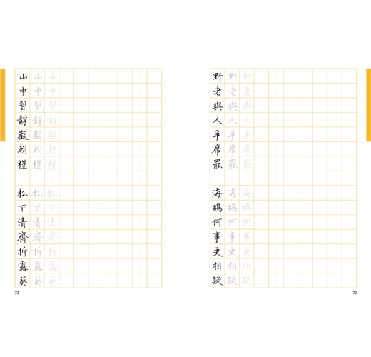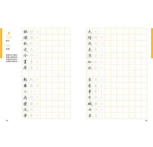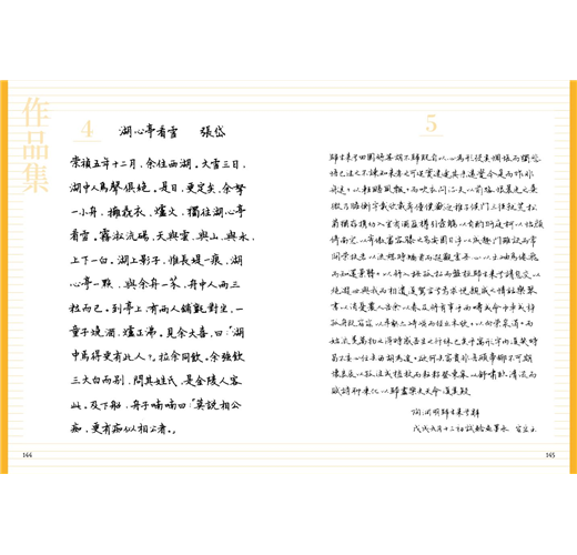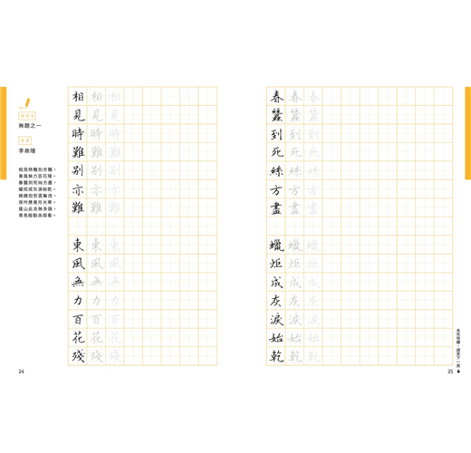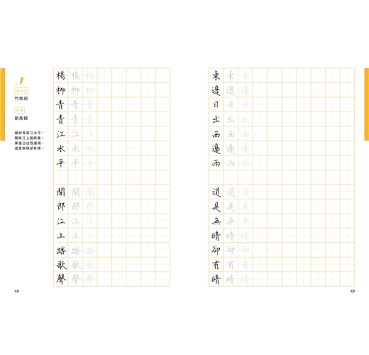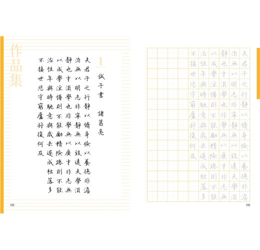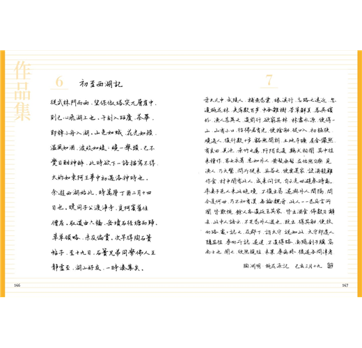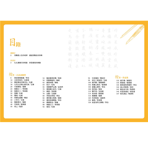 除了40首的七言絕句或律詩外,亦特別規劃了7篇較長的散文或小品,一來可以欣賞作者書寫長篇大作時的「行氣」,再者其中幾篇也安排了練習的章節,讀者也可以透過臨摹完成一篇美字。