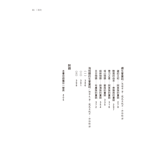 將近二十五年的歲月過去了,距離我在一九九三年寫〈山林的悲歌―布農族田雅各的小說〈最後的獵人〉〉(隔年一九九四年刊登《國文學報》),台灣的社會已有許多的變化,愈來愈多的人理解到原住民對臺灣文化歷史的意義與重要性。甚至二○○一年之後,官方的族群認定新增了噶瑪蘭族(Kebalan,二○○二)、太魯閣族(Truku,二○○四)、撒奇萊雅族(Sakizaya,二○○七)、賽德克族(Seediq,二○○八)、拉阿魯哇族(Hla’alua,二○一四)、卡那卡那富族(Kanakanavu,二○一四)等六族。這期間我依舊關懷著原民文學,有十幾年講授臺灣文學的課程,源頭即從原住民族的神話、傳說、故事的介紹開始,後來也蒐集一些譯作,請友人、學生翻譯,但總因諸事紛紜,無力為繼,手邊也總是累積一堆做到一半的文件檔,不停被其他工作插入已是家常便飯,有時尋到電腦多年前的舊檔案,內心總是一驚,但也無可奈何。又由於資料散亂及檔案版本眾多,在步入花甲年之際,那真實的、可靠的記憶更是難以尋覓,在電腦前真有四顧茫茫之悲,最後也只能勉為其難找出自認較可靠卻可能是不可靠的檔案。依稀記得的是當時蒐集到的內容涵蓋各族,故事數量頗為可觀,但因多為日文撰寫,且時有參雜舊式日文情況,對臺灣讀者而言,終究不便,便陸續有翻譯念頭。近年幸而有杉森藍及鳳氣至純平、許倍榕賢伉儷協助,將我所蒐集的有關原住民文學的日文作品予以中譯,今日方得以進入出版作業,然則距離初稿完成,硬生生又被我耽擱半年了。