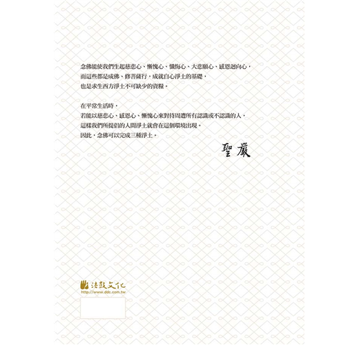 《聖嚴法師教淨土法門》繼《聖嚴法師教觀音法門》、《聖嚴法師教默照禪》、《聖嚴法師教話頭禪》後出版,將聖嚴法師修行方法的教示做了最完整的呈現。猶記二○○九年初,我們以報恩念佛的方法送恩師最後一程,並於荼毘典禮到追思暨植存期間轉為念佛禪,而今於圓寂週年之際出版此書,使其教法形諸文字得以流傳,相信也是回報師恩最好的方式。(法鼓文化編輯部)