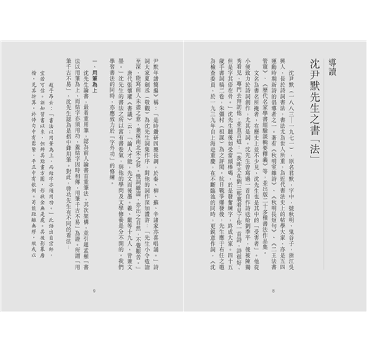 他終生沉浸於書法研究,不遺餘力從事書法教育的普及工作。本書彙編整理了沈先生為初學者和青年人論述書法之道的文章凡七篇。這些文章結合其七十年運筆心得,以最淺白易懂的文字,談論書法練字的規範和法則,多年來,一直是海內外有志學書者十分珍視且實用的南針。書中並選錄沈先生《怎樣練好使用毛筆習字》、《臨褚遂良〈伊闕佛龕之碑〉》等四篇具代表性的書法作品,以及他筆下經常提到的名家作品圖影,讀者參照臨摹、濡筆領會之際,當能親切體驗我國書法藝術獨特秀美之致。