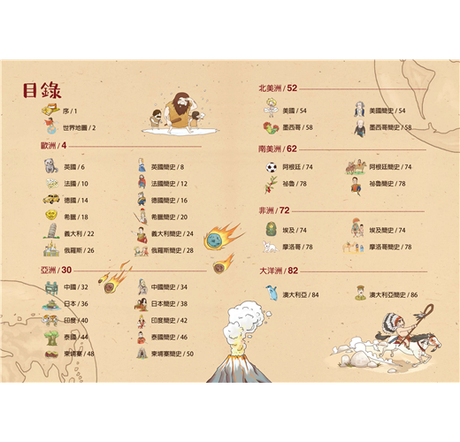 全書超過1000幅全彩手繪插圖,帶你盡覽18個國家的文明變遷丶地理名勝、美食文化。穿越200萬年的歷史橫軸,時光飛船帶我們在歷史洪流中翺翔,讓你享受足不出戶卻能環遊世界,步行千萬里。