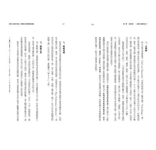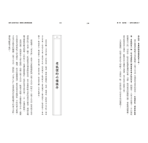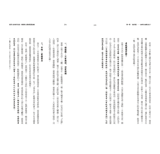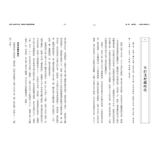 《孫子兵法》是我們獨有的瑰寶,多數人對它的認識,大概只停留在預官考試會考的印象之上,讀完背完,考試通過也就算了,殊不知《孫子兵法》是一門值得把玩一輩子的大智慧,短短六千多字,含金量卻足以讓我們受用好幾輩子。如果你只是把它當成像《古文觀止》之類的文言文咬文嚼字,或是像學者一樣字斟句酌,考究老半天,恐怕就錯失一個讓腦袋升級的大好機會。