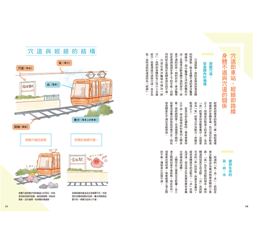 穴道在東洋醫學中稱為「經穴」,我們的身體約有三百六十五處經穴。負責連接穴道與穴道,並且為氣、血所流經的通道則為「經絡」。經絡就如通電車的軌道一樣,錯綜複雜地遍佈於身體各處,而穴道位於軌道之上,就相當於軌道上的車站。名為「血」的電車則承載著養分,並藉著名為「氣」的電力作為動力,奔馳於軌道之上。