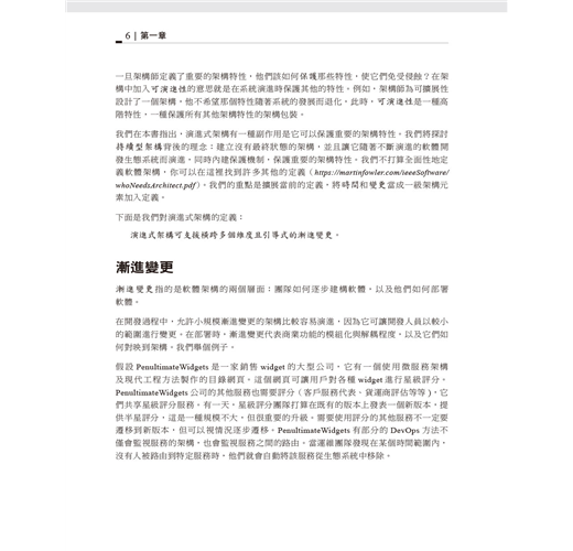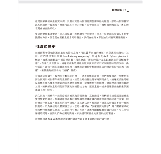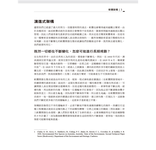 由於軟體開發生態系統不斷變化,持續提供新工具、框架、技術與規範,架構師再也不能只做靜態的規劃了。這種情況讓脆弱系統的擁有者頭疼,卻也因此帶來終極解決方案。近年來,軟體工程實踐法的核心——漸進開發已奠定了基礎,讓人們重新思考該如何隨著時間演進架構。本書整合這些實踐技術,提供新的方式,讓你重新思考「架構」與「時間」的交會點。