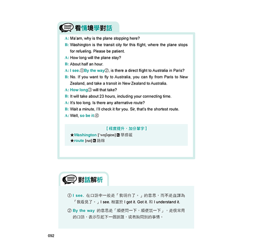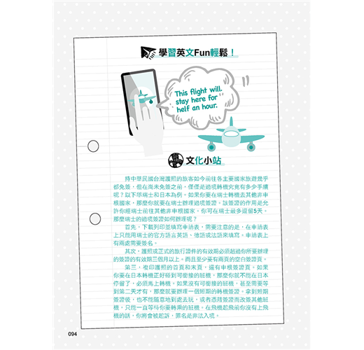 本書特別設計的「學習英文Fun輕鬆」,包含了英文笑話、漫畫和電影分析等三種形式,讓你在學習之餘,可以放鬆心情,享受為了旅遊兒學英文的愉快氛圍;另外在各單元裡的「文化小站」部分,則對一些國家進行介紹,有的是旅遊攻略,有的是風俗習慣,畢竟旅遊想玩得深入自在,這些可絕不能少!