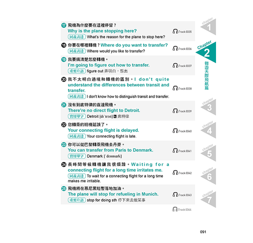每單元「精選實用會話例句」的25個句子都是最道地的會話句,每句皆附有中文翻譯,其中的實用單字和片語,是從例句中特別精選出來的重點單字和常用片語,你可以透過「實用詞組」所提取出來的固定搭配形式,將單字和詞組現學現賣;當然也能夠利用「類似表達」,將你想講的話換句話說。英文會話開口不死板,出國才會人見人愛!