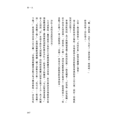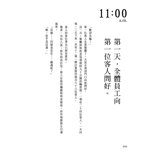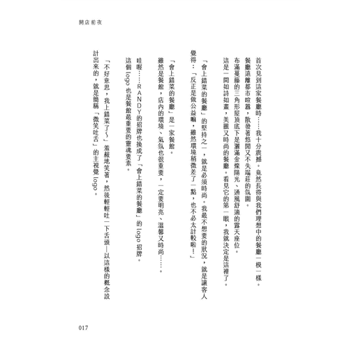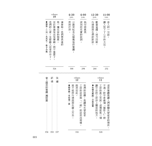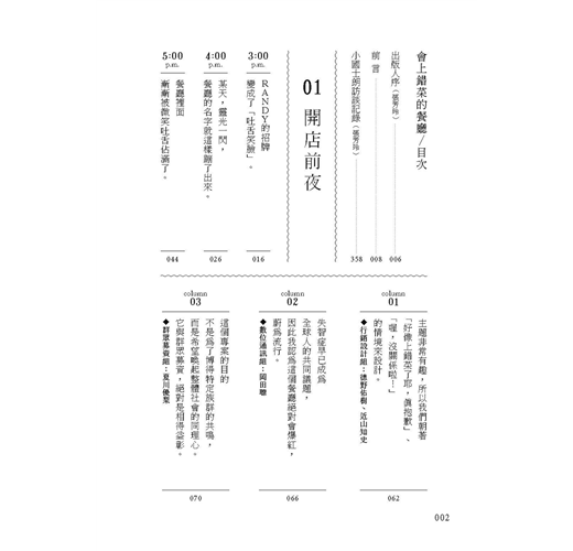 前言 006 01開店前夜 3:00 p.m. RANDY的招牌變成了「吐舌笑臉」。 4:00 p.m. 某天,靈光一閃,餐廳的名字就這樣蹦了出來。 5:00 p.m. 餐廳裡面漸漸被微笑吐舌佔滿了。 Column 01 主題非常有趣,所以我們朝著「好像上錯菜了耶,真抱歉」、「喔,沒關係啦」的情境來設計。 *行銷設計組 德野佑樹、近山知史 Column 02 失智症早已成為全球人的共同議題,因此我認為這個餐廳絕對會爆紅,蔚為流行。 *數位通訊組 岡田聰 Column 03 這個專案的目的不是為了博得特定族群的共鳴,而是希望喚起整體社會的同理心。它與群眾募資,絕對是相得益彰。 *群眾募資組 夏川優梨 02 第一天 9:00 a.m. 令人懷念的熟面孔出現了。 11:00 a.m. 第一天,全體員工向第一位客人問好。 12:10 p.m. 三川伉儷演奏的琴聲,恬靜而豐盛地緩緩流瀉。 2:30 p.m. 每位客人都有自己的「理由」。 5:00 p.m. 第一天最後的第四場,順利往終點邁進。 Column 04 我不知道「會上錯菜的餐廳」今後將有什麼樣的演變,但我認為這個概念將會衍生出更多創意與構想,並且繼續傳承下去。 *廚房組 三宅伸幸 Column 05 飲食的力量竟能以這種方式呈現,實在令人欣喜。吃著美味的食物,所有人全都打成一片,真是太棒了。 *廚房組 坂下大樹 Column 06 即使對方帶來了困擾,也可以選擇「算了,沒關係」。平常我們就該營造出讓對方願意:「算了,沒關係」的氛圍。 *廚房組 小手川由佳 Column 07 這三天內,其他同仁也會跑來看一下狀況。大家都認為,可以從這家餐廳學到許多東西。 *廚房組(甜點) 平野靖子 03 第二天 9:00 a.m. 傾盆大雨中,一位客人從大阪遠道而來。 1:00 p.m. 一位工作人員臉上的笑容消失了。 6:30 p.m. 「朝著高品質餐廳的目標邁進」。 Column 08 經過這家餐廳的洗禮之後,我認為多與家人或親友以外的失智症患者接觸,實在很重要。 *廚房組(飲料) 沖中直人 Column 09 健康的常人與失智症者沒有優劣之分,僅僅只是不同而已。這家餐廳的出發點,正是為了讓你我學習接納、體諒這個不同之處。 *廚房組(飲料) 和田 剛 04 第三天 9:00 a.m. 每個人都在自己的崗位上,盡全力做到最好。 11:00 a.m. 客人的一句話,讓人放下了心中的大石。 12:30 p.m. 歡喜雀躍,活力四射。外場服務生們的對話。 6:00 p.m. 執行委員長深刻而充實的致詞。 6:30 p.m. 以微笑吐舌化解尷尬的餐廳,即將打烊。 Column 10 演奏時,我們想表達的是一種生存的態度,至於樂曲有沒有彈錯,倒不重要了。我們的心意,全都融入在音符中了。 *演奏 三川一夫先生 泰子小姐 Column 11 這家餐廳是讓人們接觸失智症者的場所。不過,對平常像個「隱形人」般工作的員工來說,這裡就是一個讓平日的工作浮上檯面的地方。 *社福支援組 小林由憲 Column 12 我們的目標,是讓有失智症者工作的店家與「一般」的店家沒兩樣。既然如此,就不能將外場服務生捧上天去。 *廚房組 木村周一郎 後續 終場 「會上錯菜的餐廳」團隊圖